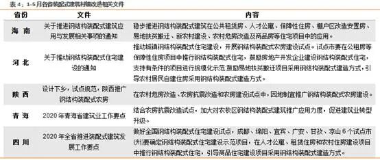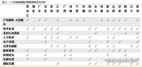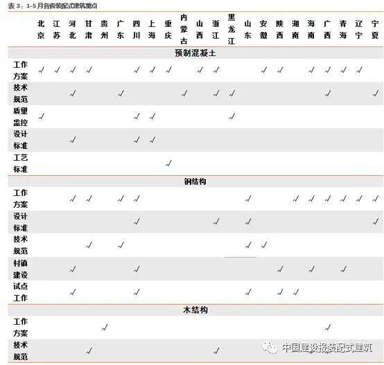 下表是近5個(gè)月來(lái),各省發(fā)布的裝配式建筑相關(guān)文件。總體而言裝配式建筑不僅在專項(xiàng)文件中重點(diǎn)強(qiáng)調(diào),在綠色建筑、低耗能建筑、科技建筑等文件中均有所提及。這說(shuō)明裝配式建筑作為綠色、科技建筑的有益補(bǔ)充,正努力實(shí)現(xiàn)與建筑產(chǎn)業(yè)轉(zhuǎn)型發(fā)展。