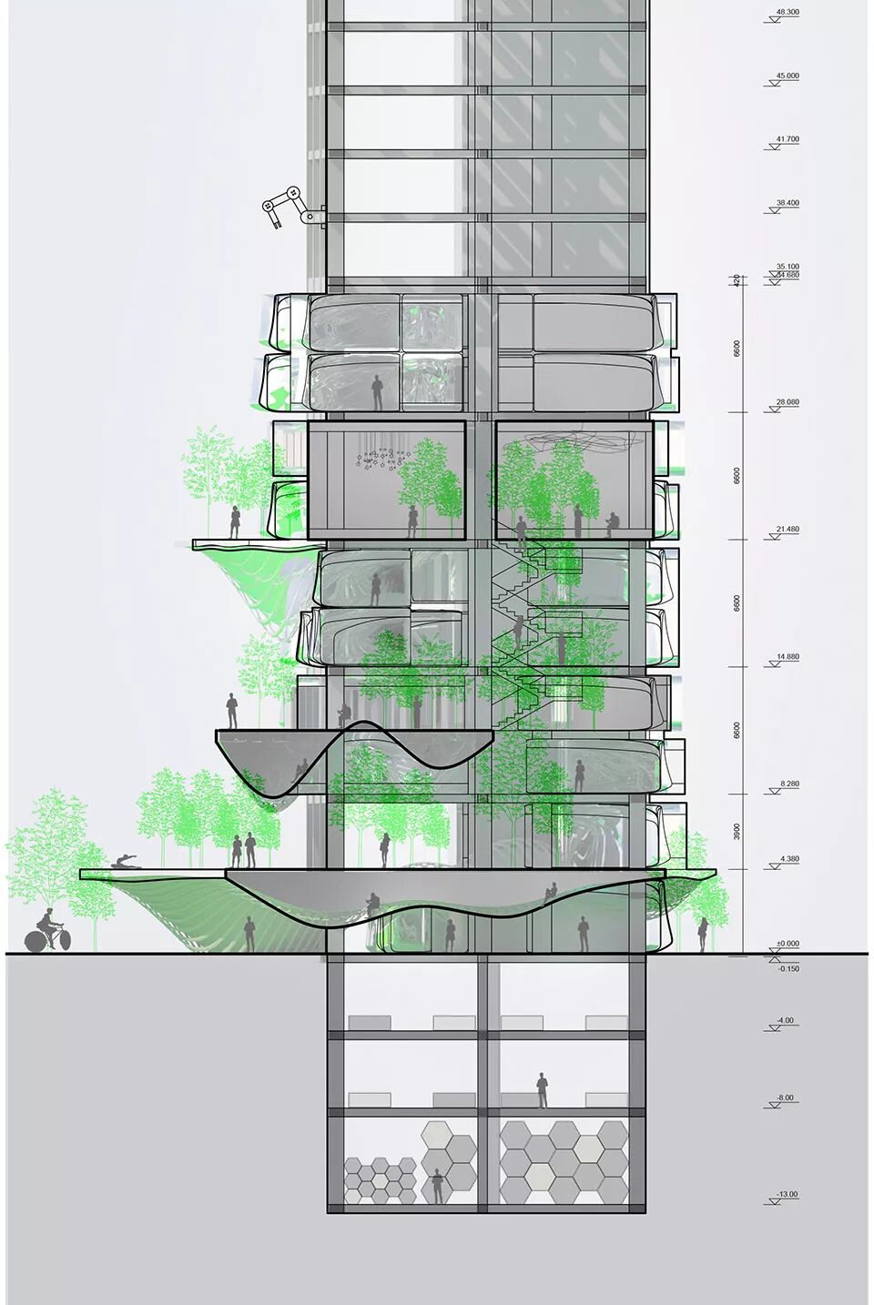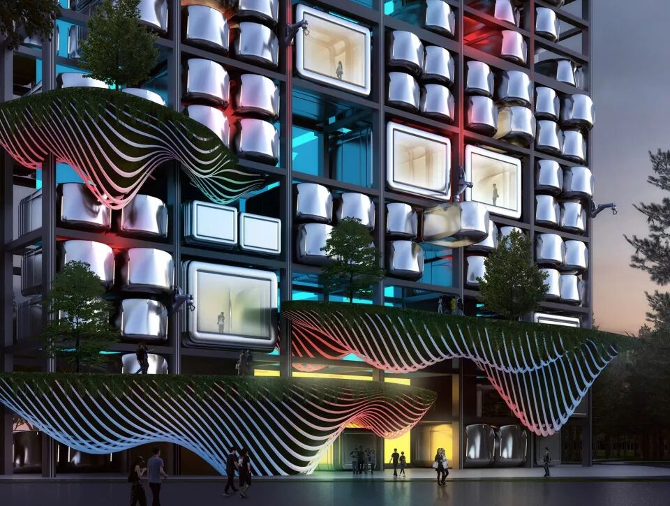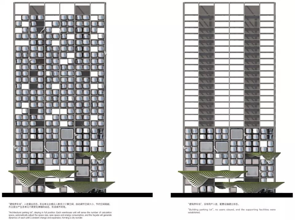 居住模塊與建筑完全實現(xiàn)裝配化生產(chǎn),居住模塊連入自動駕駛技術(shù)進行行駛操作,建筑內(nèi)不是唯一的居住地,居住模塊通過可接駁式連接與建筑聯(lián)通。建筑不再需要圍護結(jié)構(gòu),轉(zhuǎn)變?yōu)橥?烤幼∧K的綜合服務(wù)器。