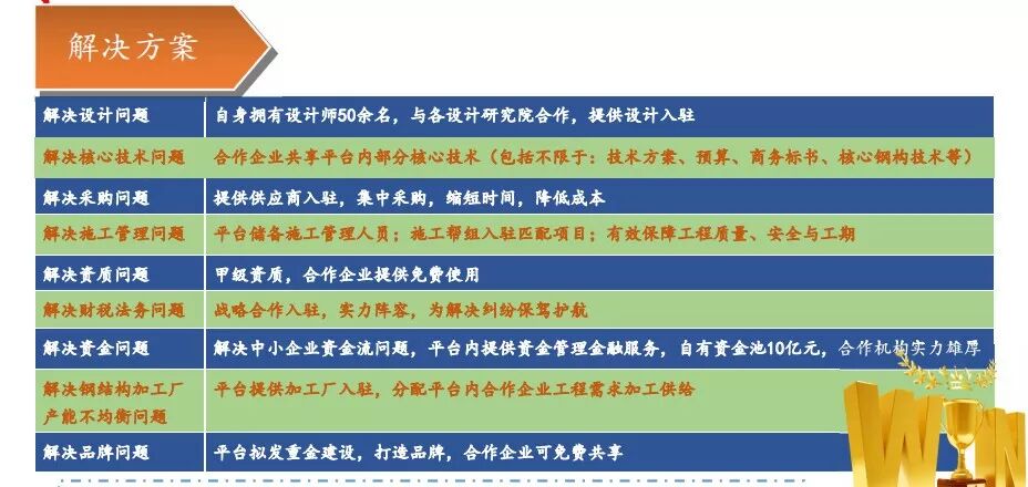 面對行業(yè)痛點,建鋼聯(lián)致力于解決買賣雙方企業(yè)在交易過程中,產(chǎn)生的設(shè)計、施工、資質(zhì)、法務(wù)、資金周轉(zhuǎn)等難題,提供從工程設(shè)計、施工、預(yù)算、招標(biāo)投標(biāo)、資質(zhì)合作、項目談判簽約、項目管理、成本管理、專家論證、產(chǎn)業(yè)鏈材料供應(yīng)及裝配式鋼構(gòu)教育培訓(xùn)及金融等全套鋼結(jié)構(gòu)工程解決方案。