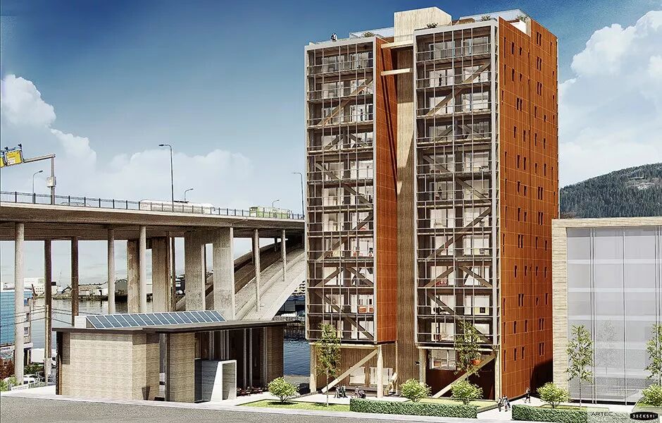 這個34層高的前景展望方案打算使用實木和交叉層壓木板建造梁柱,并將其與一個混凝土核心筒連接在一起以實現(xiàn)穩(wěn)定性。公寓里面的天花板和窗框會使用木材制作,從室外透過玻璃立面可以看見。