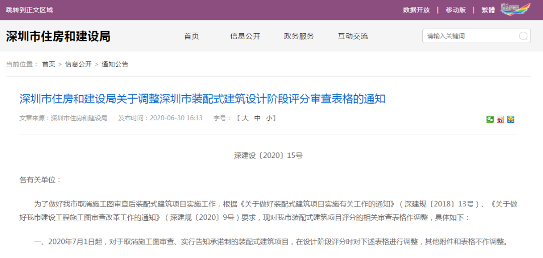 近日,深圳市住房和建設局發(fā)布了《關于調整深圳市裝配式建筑設計階段評分審查表格的通知》。